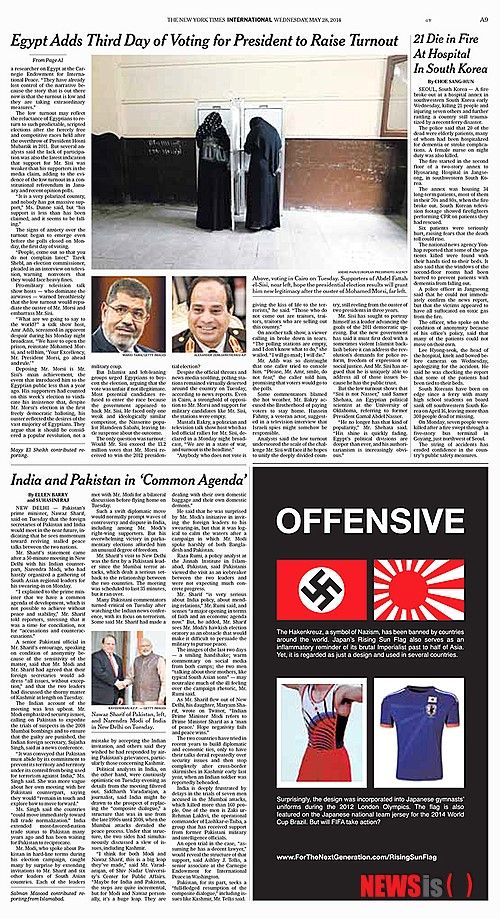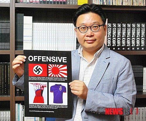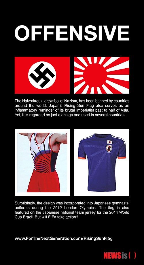 ソ・ギョンドク教授の企画、ドイツのナチス旗と比較【ニューヨーク=ニューシース】ノ・チャンヒョン特派員日本サッカー代表チームの戦犯旗模様を批判する広告が、ニューヨークタイムズに掲載された。28日、Aセクション9面下部に掲載された広告は、今年三一節から「世界の日本の戦犯旗退治キャンペーン]を展開している韓国広報専門家のソ・ギョンドク誠信女子大教授が企画したもので、ブラジルのワールドカップに着て出てくる日本サッカー代表チームのユニフォームの問題点を指摘する内容だ。ソ・ギョンドク教授は、日本の戦犯旗を世界の人々が簡単に理解できるように、ドイツのナチス旗と比較して、「侮辱的な(Offensive)」という大きなタイトルの広告を通じて、「日本の戦犯旗模様が単純にデザインであると誤認されていて、全世界でまだ使用されている」と問題の深刻性を悟らせた。続いて「驚くべきことに、2012年ロンドンオリンピック日本体操国家代表選手たちのユニフォームでも、戦犯旗模様が使用された。さらに今回のブラジルのワールドカップサッカー日本代表チームのユニフォームでも使用される予定である。 FIFAはじっとしているのか?」と強く批判した。ソ・ギョンドク教授は「今年の初めから、FIFAのホームページでワールドカップ本選進出国の代表チームのユニフォームを販売し始めましたが、日本の戦犯旗模様論争が起きると、デザインについての説明フレーズだけを軽く変更して、まだ販売している」と指摘した。また、「過去のオリンピック体操ユニフォームに続き、今回ワールドカップまで戦犯旗模様が使用されるのは、国際的なスポーツ精神に反するものであり、特に政治的表現を禁止するFIFAの規定に反することなので、これを世界の人々に正確に知らせたい」と付け加えた。特に今回の広告の下には、公式ホームページ(www.ForTheNextGeneration.com)を入れて、YouTubeと連携して、日本の戦犯旗の誕生の背景と歴史、世界中で誤って使用されている事例などを映像で製作した後、世界の人々がより簡単に理解できるようにした。ソ教授は、今回の広告のファイルとYouTubeのビデオを、FacebookやTwitterなどのSNSのアカウントでの継続的な広報を通じて、国際的な世論を造成して、ブラジルのワールドカップの時に戦犯旗模様を使用できないようにすることを最終目標としていると明らかにした。一方今回の広告費用は、ソ教授と一緒に世界中の主要なメディアで韓国の文化と歴史に関する広告キャンペーンを一緒に繰り広げているチキンマルが全額後援した。引用ソースhttp://news.naver.com/main/read.nhn?mode=LSD&mid=shm&sid1=104&oid=003&aid=0005873693