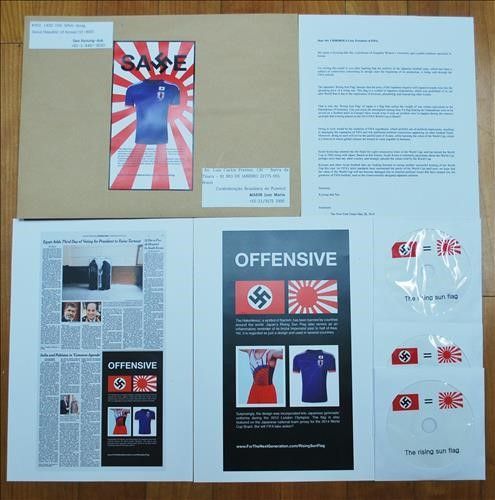 世界32カ国のサッカー協会に「旭日旗=戦犯旗」の排除要求デザイン誤用の例もCDにして、32カ国のサッカー協会に(ソウル=聯合ニュース)ワン・ギルファン記者韓国広報専門家ソ・ギョンドク誠信女子大教授は、元サッカー界を相手に、ブラジルのワールドカップに出場する日本代表チームのユニフォームの「戦犯旗模様」を削除してくれと要請している。ソ教授は2日午前、ブラッター国際サッカー連盟(FIFA)会長と本選出場32カ国のサッカー協会長、ユニフォームをデザインしたアディダスのデザインチームに、日本チームのユニフォームの「戦犯旗模様」を削除するよう要請している郵便物を一斉に発送した。彼は先月28日(現地時間)、米国の有力日刊紙ニューヨークタイムズ9面に「戦犯旗模様」のユニフォームを批判する広告を掲載した。世界の人々が容易に理解できるよう、ドイツのナチス旗と並べて日本の戦犯旗を配置した後、日本の戦犯旗模様をシンプルなデザインだと間違ってまだ使用している国があると指摘した。ソ教授が発送した郵便物は、戦犯旗模様の削除を訴える手紙、ニューヨークタイムズに載せた広告ファイル、日本の戦犯旗の誕生の背景を説明する資料、全世界がまだ間違って使用している戦犯旗デザインを紹介する映像CDなどが入れられている。ソ教授は「政治的表現を禁止するFIFAの規定に基づいて、戦犯旗のデザインは有り得ないこと」としながら「これを使用したことを単純に非難するだけではなく、FIFA側に日本の戦犯旗の正確な事実を知らせることが重要であると判断して、郵便物を発送した」と説明した。FIFAは去る3月初め、ホームページでワールドカップ本選進出国のユニフォームを販売した。当時、日本のユニフォームについて多くのネチズンが「戦犯旗模様」と激しく批判し、FIFAはデザインの説明フレーズを「rising sun ray」から「flash of a bright red across the back」とこっそり変えて、まだ販売している。ソ教授は「説明のフレーズだけ変えて解決する問題ではなく、誤ったデザインがどれだけ多くの人々に大きな痛みを与えるのかを知らせたかった」と強調した。彼は3.1節から、「全世界から日本の戦犯旗を退治するキャンペーン」を展開している。各国の在外同胞と留学生と、戦犯旗のデザインを使用しているケースについて情報提供を受けて、担当機関に連絡して、使用しないよう要求している。アメリカ自然史博物館の壁画、英国の有名なリゾート地、ブライトンビーチ、オーストリア・ウィーンのプラモデル展示会など、これまでに50カ所の情報提供を受けた。彼は「欧米諸国では、日本の戦犯旗がシンプルなデザインだと誤認していて使用している場合が多かった」とし、「世界の人々への広報を強化するため、今後「旭日旗=戦犯旗」という意味のフェイスブックの広告を出す計画だ」と明らかにした。彼は郵便を送り、2日ブラジルに出国して、10日に帰ってくる予定だ。ブラジルではテレビでソ・ギョンソク氏と進行されるハングルの勉強部屋支援プロジェクトと、サンパウロの若者たちのためのK-特別講演などを繰り広げる予定だ。引用ソースhttp://news.naver.com/main/ranking/read.nhn?mid=etc&sid1=111&rankingType=popular_day&oid=001&aid=0006938836&date=20140602&type=1&rankingSectionId=104&rankingSeq=100