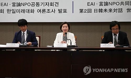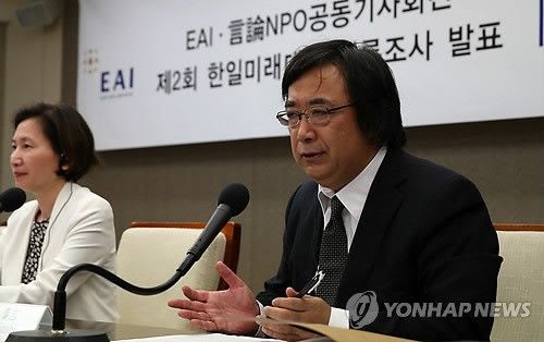 ↓左からチョン・ハンウル事務局長、東アジア研究院(EAI)のイ・スクジョン院長、日本市民団体「言論NPO」の工藤泰志代表昨年実施された同様の調査では、我々国民が「軍事的脅威となる国に挙げた国」は、北朝鮮(86.7%)、中国(47.8%)、日本(43.9%)などの順だった。日本人は、韓国が軍事的脅威になるという回答は15.1%で、北朝鮮(72.5%)、中国(71.4%)、ロシア(29.0%)に続いて四番目であった。今回の調査で、日韓間の軍事紛争の可能性については、韓国人(47.9%)と日本人(57.0%)のいずれも「起こらない」という回答が多かった。しかし韓国人の中には「(軍事紛争が)遠い将来に起こる」という回答も34.1%を占めた。一方日本人は、このような回答が8.8%にとどまった。特に、最近の歴史・領土問題などをめぐる両国間の対立が深刻化して、日本人の対韓認識が急速に悪化していることが分かった。相手国の印象を問う質問に、日本人は54.4%が韓国に対して「大体良くない」または「良くない」と答え、昨年の調査よりも否定的な回答が17.1%ポイント増加した。韓国の回答者も、日本に対する印象が良くないという回答が70.9%と大多数を占めたが、否定的な回答は昨年よりやや減少した。相手国の印象が否定的な理由(2つ複数回答)については、韓国人は「韓国を侵奪した歴史を反省しないから」(76.8%)と「独島問題」(71.6%)を最も多く挙げた。日本人は、「歴史問題で日本を批判するから」(73.9%)という回答が最も多かったが、これは昨年より18.1%増えたものである。「韓日歴史問題と関連して、問題を解決することが重要だと思うか」という質問(複数回答)には、日韓の回答者の両方とも相手の「歴史教育」の問題を取り上げて、交錯した認識を示した。韓国人は、日本の歴史教科書問題(81.9%)、日本人の軍慰安婦認識(71.6%)などを主要な先決課題として挙げた。一方日本人は、韓国の反日教育や教科書の内容(56.1%)、日本との歴史問題に対する韓国人の過剰な反日行動(54.4%)などを挙げた。加えて、韓国人の53.1%が、日本の政治的・社会的動作原理を「軍国主義」と見ており、日本人の44.8%が韓国を「民族主義」社会と見ていることが調査された。しかし両国の国民は、現在の悪化する日韓関係が改善されなければならない必要性を認識していることが分かった。現在の日韓関係が「悪い」と答えた韓国人は昨年より10.4%ポイント、日本人は18.7%ポイント増加した。これと関連して、韓国人(46.4%)日本人(31.4%)の両方とも、このような状況が「問題であり、改善する必要がある」という回答が最も多かった。調査を共同主催したイ・スクジョン東アジア研究院院長は、「韓国の歴史問題に対する強力な批判に対して、日本国内での反応が大きくなっている」と診断した。日本の工藤泰志「言論NPO」代表は、「国民感情や認識が、メディアの報道に依存して助長・拡大されている傾向がある」とし、「近い国であるにもかかわらず、直接の交流があまりにも不足している状況だ」と指摘した。今回の調査は19歳以上の韓国の男女1千4人と18歳以上の日本の男女1千人を対象に、過去5~6月に実施(韓国は面接調査、日本は訪問誘致回収法)され、信頼水準は95%、誤差範囲は±3.1%である。