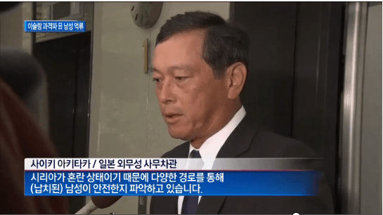 去る16日、シリア北部のアレッポで撮影された映像が公開されると、日本列島が大騒ぎとなりました。アレッポは極端なイスラム主義武装勢力の「イスラム国」が掌握しているところです。対立する側への残虐行為で悪名が高い「イスラム国」は、シリアが内戦で混乱を経験している隙に、国土の3分の1以上を掌握しました。日本政府は近隣のヨルダンに緊急対策本部を設置して、関連情報の収集に着手しました。[録音-齋木昭隆/日本の外務省事務次官]「シリアが混乱状態なため、さまざまな経路を介して(拉致された)男性の安全を把握につとめている。」日本のマスコミは、この男性がSNSを介して、自分自身が民間軍事企業を運営しているとシリア現地で撮影している映像を公開したと伝えました。まだ殺害の脅威や身代金要求が出てこない状況で、日本政府は男性の生死に神経を尖らせています。チャンネルAニュースのアン・コンウでした。引用ソースhttp://news.naver.com/main/read.nhn?mode=LSD&mid=shm&sid1=104&oid=449&aid=0000029162http://news.naver.com/main/read.nhn?mode=LSD&mid=shm&sid1=104&oid=001&aid=0007074333