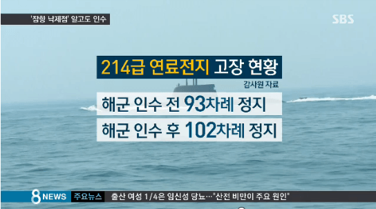 <アンカー>最近の数年間で建造された海軍の最新鋭潜水艦が、知られている性能には及ばないのに、海軍がこれを無視して買収した事実が明らかになりました。一度潜水すると、数週間連続の深海作戦が可能だと知られていたが、全く違いました。キム・テフン記者が取材しました。<記者>いわゆる214級と呼ばれる1千800トン級の海軍の最新鋭潜水艦です。2008年、「孫元一(ソン・ウウォンイル)艦を筆頭に、安重根艦まで3隻が戦力化されました。[海軍関係者:既存の潜水艦(209級)は、一度水の中に入ると、数日しか耐えることができません。しかしこの潜水艦(214級)は、数日から数週間の間、水の中に作戦することができる性能を持っており…]しかし実際は、連続潜航が可能な期間は、数週間ではなく数日に過ぎませんでした。空気がない水中では、エンジンを稼動する燃料電池が十日以上動作する必要がありますが、たびたび停止するためです。潜水艦3隻の燃料電池は、海軍が買う前、すでに93回も故障していたという事実も確認されました。海軍はこれを知りながらも3隻を買い、買った後も、燃料電池はなんと102回も停止しました。監査院の監査の結果、防衛事業庁は、十日以上の連続動作が必要なドイツ製の燃料電池を、一日だけ稼働を試みた後で合否の判定をしたものと判明しました。[アン・ギュベク/新しい政治民主連合議員、国防委員会所属:潜水艦の最大能力を確認してから、戦力化をすべきであったにも関わらず、どんぶり勘定式で試験評価したのは問題があります。]防衛事業庁は、進水して6年目である昨年、燃料電池の冷却システム上の問題を見つけて、今年の上半期に修理を終えたと明らかにしました。修理した燃料電池が深海で十日以上動作するかどうか、今月中に再検証する計画だと防衛事業庁は明らかにしました。引用ソースhttp://news.naver.com/main/ranking/read.nhn?mid=etc&sid1=111&rankingType=popular_day&oid=055&aid=0000288523&date=20141009&type=2&rankingSeq=2&rankingSectionId=100