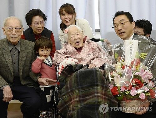 (東京=連合ニュース)キム・ヨンス特派員男女を通じて世界最高齢としてギネスブックに登録されている日本の大阪市の大川ミサヲ(女)さんが、5日に117歳の誕生日を迎える。共同通信などによると、大川さんは誕生日を翌日に控えた4日、大阪東住吉区の老人ホームを訪問した区役所の関係者がお祝いの花束を渡すと、「結構なお花ですね」と笑顔で答えた。彼女はこれまでの人生が長かったかという質問に、「短かった」と答えており、長寿の秘訣は何なのかと尋ねると「分からない」と述べた。大川さんは、2013年の114歳の時、世界の女性の最高齢としてギネスブックに登録されており、その後男女を通じて世界最高齢者になった。老人ホームによると、1898年生まれの彼女は耳が遠く、車椅子に頼って生活しているが、健康状態は良好である。引用ソースhttp://news.naver.com/main/ranking/read.nhn?mid=etc&sid1=111&rankingType=popular_day&oid=001&aid=0007444248&date=20150304&type=1&rankingSeq=4&rankingSectionId=104
