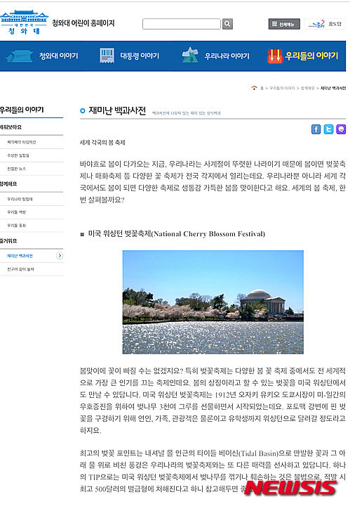「4月8日は、ワシントンの韓国桜の独立宣言の日」【ニューヨーク=ニューシス】ノ・チャンヒョン特派員「1943年4月8日、韓国の桜が失われた名前を取り戻した日です。」今から72年前の1943年4月8日、李承晩博士はワシントンDCのアメリカン大学のキャンパスで、ポール・ダグラス総長と韓国人学生のドリス・ユンなどと共に、済州ソメイヨシノ(王桜)を植えるイベントを開催した。李承晩博士は、東京市が寄贈したソメイヨシノ(王桜)が、日本桜(Japanese Cherry Trees)と呼ばれるのは間違っているとして、韓国桜(Koeran Cherry Trees)に変えることを要請したが、米国政府は証拠不足を理由にして、「東洋桜(Oriental Cherry)」という中立的な名前を代案として提示したことが分かった。それで李承晩博士は、ダグラス総長などと協議して、米国の中心部に位置する大学キャンパスに、四株のソメイヨシノ(王桜)を植えて、これを「韓国桜」として公式に命名する行事を行なったのだ。ワシントンの在米ジャーナリストのムン・キソン氏は5日、ニューシスとのインタビューで、「1943年4月13日付の『アメリカンイーグル(The American Eagle)』が、『日本産』として誤って知らされており、ワシントンの桜の本当の名前を探すため、李承晩博士が韓国桜の植栽イベントを開催した」と報道された事実を喚起させて、「ソメイヨシノ(王桜)の植樹は、30年以上前に日本の木に変身させられた韓国の桜のもう一つの独立宣言だ」と評価した。さらに当時、J・E・ランキン下院議員が「ワシントンに植えられた桜は、韓国の鬱陵島が原産地であり、上・下院はこれらの木を韓国桜であることを宣言している」という決議案まで発議したという事実をもとにして、桜の真実を知らせる作業を積極的に展開しなければならないと強調した。ワシントンのポトマックの川沿いには、1912年に日米友好の象徴として、日本がプレゼントした桜3000本が植えられており、以降、大々的な桜祭りが日本文化イベントと共に開かれている。興味深いのは、日本が当初1910年12月に寄贈した桜2000本は、到着直後に病虫害感染が確認されて焼却されたという事実である。日本はワシントンのために3020本、ニューヨークのために3000本を手に入れて、14ヶ月後の1912年2月、シアトル港を経てワシントンDCに送った。しかし短期間に6000本を超える桜を集めて米国に送ることができるものか、まったく納得がいかない。苗木を採集して包装し、検査し、再び包装し、輸送するなどの過程を経るには、2倍以上の確保が基本であるという点で、1万2000本以上の苗木を収集したという分析も提起されている。東洋美術史の学者ジョン・カーターコベル(1910~1996)先生は、生前に発表した文で、「東京市長が1910年に荒川川岸の桜をワシントンにプレゼントしたが、虫に食べられて枯れた。日本は新しい品種の桜を再びプレゼントしたが、この時の桜は済州島で採集したもので、米国の風土で強く生き残るためと考えられる」と指摘している。日本ではこれまで桜の自生地が1カ所も発見されたことがないのに対して、1908年の済州漢拏山一帯では、200年以上の桜の群落地をフランス人の花嫁が発見し、報告している。日本植民地時代の1932年、日本の学者の小泉は、論文を通じて、日本の桜が韓国起源だと認めたが、解放後、日本の学者たちはこれを否定している。済州出身でもあるムン・キソン氏は、「今でも済州で1911年ごろソメイヨシノ(王桜)が採取されたという事実が記録された資料がある。政府レベルで隠された歴史の発掘に乗り出すべきだ」と提案した。それと共に、大統領府のホームページのワシントンの桜祭りを促進する内容は問題があると述べた。大統領府子供ホームページ「世界各国の春祭り」のところには、桜祭りの全景写真と共に、「米国のワシントン桜祭りは、1912年に尾崎行雄東京市長が、米-日間の友好増進のため、桜3000本をプレゼントしたのが始まりである。ポトマック川沿いに咲いた桜を見物するために、恋人、家族、観光客はもちろん、留学生までもがワシントンに走って行くほどだ…」と紹介している。ムン・キソン氏は「4月初めに前後して、ワシントン一帯で繰り広げられる大規模な桜祭りは、日本を促進する巨大な文化商品である。大統領府のホームページには、ワシントン桜の故郷は韓国であり、初代大統領李承晩博士をはじめとして、ワシントン桜に我が国の名前を探すことに努力した先覚者たちの努力があったという内容が記述されなければならない」と指摘した。引用ソース(2015-04-06 ニューシス)http://news.naver.com/main/read.nhn?mode=LSD&mid=shm&sid1=104&oid=003&aid=0006446563