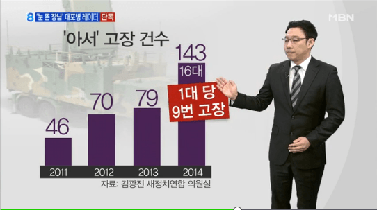 【アンカーコメント】北朝鮮の奇襲砲撃に備えて韓国軍が導入した新型レーダー装置が、些細なことで故障することが確認されました。チョン・ソンギ記者が単独取材しました。【記者】2009年末から実戦配備された新型対砲兵レーダー、別名「アーサー」です。一台あたり130億ウォンを払って、スウェーデンから取り寄せた機器で、飛んでくる敵砲弾の放物線を分析して発射位置を検出することができます。北朝鮮の西北島嶼奇襲砲撃などに迅速に対応するために、必ず必要な戦力です。しかしMBNが入手した陸軍整備レポートを見ると、故障が頻繁して運用に支障をきたしていることが明らかになりました。6台導入された2011年3月までに、全部で70件の故障が発生しました。「頻繁に同じ故障があり、装置の信頼性が低下する」と書かれています。故障の80%が、電力供給する発電機と、レーダーを稼動する作戦室部品で発生しました。故障件数は年々増加しており、昨年は16台で143件の故障が出ました。一台あたり9回の割合で故障しているわけです。軍当局は、装置の過剰使用と、島嶼地域の塩分の影響で故障したものと釈明しています。しかし内部報告書には、それではなく「部品の欠陥」を直接の原因として指摘しています。これは、最初から不十分な装備であったことを意味しています。性能試験評価が適切に行われているのか、疑問が提起される理由です。▶インタビュー:キム・グァンジン/新しい政治連合議員-「防衛事業庁や軍自らが考えている試験評価が満足のいく結果だったのか、国防部と防衛事業庁が立場を出すべきだと思う。」海軍と空軍の防衛産業不正に続いて、陸軍の不良機器導入疑惑までもが浮上しています。MBNニュースのチョン・ソンギでした。引用ソースhttp://news.naver.com/main/read.nhn?oid=057&sid1=100&aid=0000637509&mid=shm&mode=LSD&nh=20150418221617