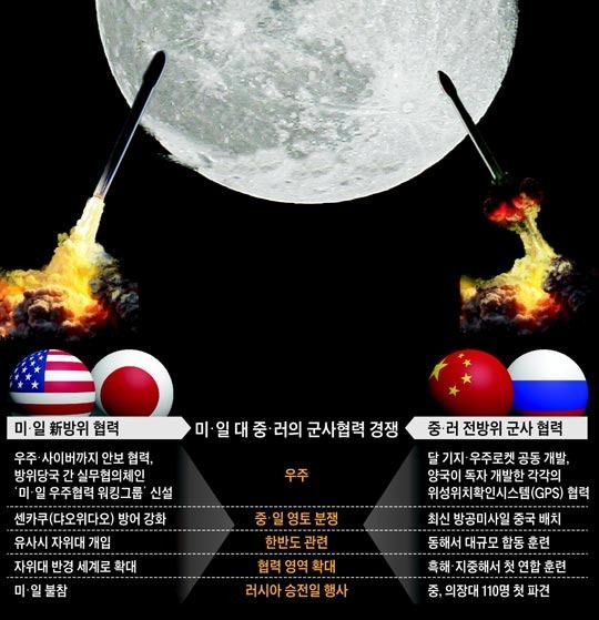 -全方位蜜月競争米・日「宇宙でも協力」、中・露「月面基地を共同建設」-米・日、密着するとすぐに…制裁を受けているロシアは中国のお金が必要…中国はロシアの宇宙技術が欲しい米国・日本対中国・ロシアの蜜月競争が、地球を離れて宇宙にまで拡大している。ロシアのドミトリー・ロゴジン(Dmitry Rogozin)副首相は、先月28日、杭州で中国の汪洋副首相に会って、「両国が月面基地の建設を含めた宇宙開発協力を強化することで合意した」と、香港明報が3日に伝えた。ロシアが2050年までに12兆5000ルーブル(約262兆ウォン)を投入する計画の月面基地建設に、中国が開始段階から参加するということだ。これは、先月27日に改定された新しい日米防衛協力指針(別名「ガイドライン」)で、日米が「どのような状況でも米・日協力する」という原則に基づいて、宇宙・サイバーまで安全保障協力を拡大することで手を取り合うことに対する中・露の対応とみられる。中国は、月面基地建設だけでなく、ロシアの宇宙ロケットを中国で生産することも希望していることが分かった。ロゴジン副首相は、「両国が独自開発した衛星測位システム(GPS)の北斗(中国)とグロナス(ロシア)の協力の問題も議論している」と明らかにした。中・露は、旧ソ連の中型輸送ヘリ(MI-26)を改良し、250~280人が乗る大型旅客機を開発するプロジェクトでも力を合わせることにした。中国国営環球時報は2日、「ロシアが最近、中国に、軍事・航空宇宙技術を開放するという信号を相次いで送っている」と述べた。安倍晋三日本総理の訪米を契機にして、日米が軍事同盟を大幅に強化して、中・露も全方位的な「軍事・安全保障協力」を披露している。1969年の中露国境紛争で銃撃戦を繰り広げた歴史があったとは信じられないほどだ。中・露は9月の中国の抗日戦争戦勝70周年を控えて、東海で史上最大規模の連合海上訓練をする。これも、日米新ガイドラインが韓半島有事の際、日本の自衛隊の介入の可能性を育てたことと関連しているという分析が出ている。朝鮮半島が米・日・中・露の間の軍事力の競争の最前線になる可能性があるという懸念も提起されている。日米新ガイドラインは、日中紛争地域である釣魚島(日本名:尖閣)防御措置を具体化した。自衛隊が敵の陸上攻撃を阻止し、米軍がこれを支援するという方法で、役割分担することを明確に明らかにしたものである。これに対抗して中国は、ロシアの最先端防空ミサイルのS400を東海岸に配置する計画である。射程距離400㎞のS400は、釣魚島を射程圏に置くことができる。ロシアがS400を輸出するのは中国が初めてである。取引規模は30億ドル(約3兆3000億ウォン)だと伝えられた。中・露は昨年5月に釣魚島近くで初の合同訓練もした。中・露が9日、ロシアの第2次大戦戦勝70周年を迎えて、黒海と地中海で連合訓練を繰り広げるのは、日米同盟の作戦範囲が世界に拡張されたものと無関係ではないという観測である。東アフリカのアデン湾で作戦中の中国東海艦隊は、黒海に初めて進入し、ロシア艦隊と海上閲兵式を展開した後、再度地中海に進出して合同訓練をする。過去の日本は原油輸送路である中東のホルムズ海峡が封鎖されても自衛隊を送ることができなかった。しかし「日本周辺」に縛られていた自衛隊の活動範囲が、新しいガイドラインを使って解除されて、状況は変わった。日・米対中・露の安保競争が、陸・海・空を越えて宇宙という4つのスペースで同時多発的に行われている局面である。中・露蜜月は9日、ロシアの勝利70周年行事を契機にして、より甘くなる見込みである。日米首脳は不参加だが、習近平国家主席は出席する。中国軍はロシアの勝利パレードに儀仗隊110人を派遣する。中国軍の儀仗隊の海外派兵は前例がない。マカオ国際軍事学会の黄東会長は、「西側から制裁を受けているロシアは、中国のお金が必要で、中国はロシアの先進軍事・宇宙技術が必要な状況だ」と述べた。引用ソースhttp://news.naver.com/main/ranking/read.nhn?mid=etc&sid1=111&rankingType=popular_day&oid=023&aid=0002965606&date=20150504&type=1&rankingSectionId=104&rankingSeq=2