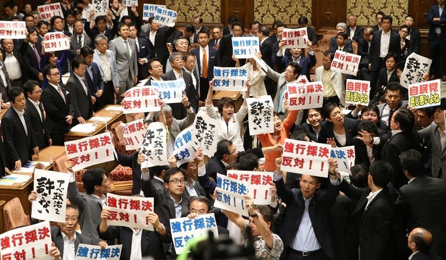 与野党は、日本の安全保障法案が参議院本会議を通過したことについて、声をそろえて糾弾した。