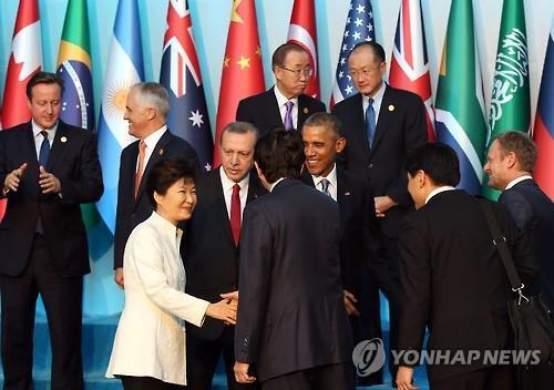 この日、朴大統領は昼食会に出席に先立って、他国首脳と一緒に団体記念写真を撮影するとき、安倍首相と握手をした。