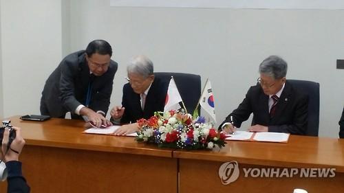 >>韓国の基礎科学研究院-日本の理化学研究所覚書締結(東京=連合ニュース)キム・ヅチョル(右)韓国基礎科学研究院院長と、松本紘日本理化学研究所理事長が25日、日本埼玉県理研で両機関間の研究協力了解覚書(MOU)を締結する署名をしている。