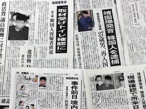 靖国神社爆発音事件と関連して、韓国人のチョン某(27)氏が9日、日本の警視庁によって東京で逮捕されたという事実を、日本の主要な新聞が10日に報じた。(チョン氏の名前と顔写真が新聞にそのまま公開されており、自主的にぼかし処理したものである)日本のマスコミは、日々の出来事・事故のニュースを伝える慣行どおり、チョン氏の実名をすべて公開し、顔もそのまま露出して報道している。