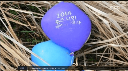 「忠州家族ファイティング」「家族が健康で」という韓国語が書かれたメッセージが付いた赤い風船は、30代の日本人家族が発見しました。