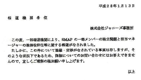 このファックスでジャニーズは「スマップの一部のメンバーの独立問題と担当マネージャーの取締役辞任等に関する報道について、該当事項について協議と交渉が行われているのは事実である」として解散が議論されたことが事実であることを認めた。