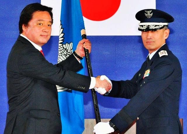 この日、沖縄の那覇基地で開かれた第9航空団の発足式で、若宮健嗣・日本防衛省副大臣は、第9航空団に司令旗を授与して自衛隊員に「国防の最前線であるこの場所で最善を尽くして自分の役割を果たしてほしい」と訓示した。
