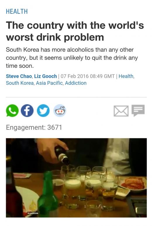 お正月の連休で、飲み会がさらに多くなったこの時、韓国が「世界最悪の飲酒問題を持つ国(The country with the world's worst drink problem)」と紹介されて、注目されている。