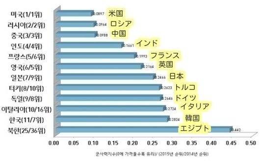 米国の民間軍事力評価機関の「グローバルファイアパワー」(Global Firepower)は、2015年末現在、各国の■陸・海・空軍兵力と装備レベル■戦時動員人数■国内総生産(GDP)と原油精製及び生産能力など、経済力■国土面積と海岸線の長さなどの地理条件を総合的に分析した結果、韓国の総体的な軍事能力は0.2824(0に近いほど強い)で、126カ国のうち11位と評価されたと明らかにした。