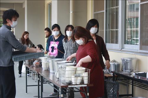 正式避難所の砂取小学校では、ちょうど朝食のためのお粥の配分が行われていた。
