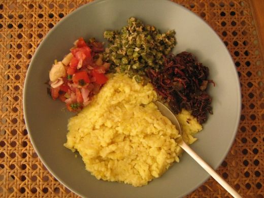 米とレンズ豆を煮た一種の粥で、ギー(ghee)と呼ばれる精製バターやカード(curd)と呼ばれる凝固させたミルクを加えて食べることもある。