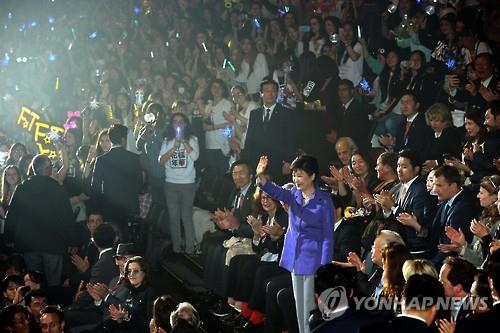 朴大統領は、韓流スターのプルラクビ公演時、客席の観客がすべて走って歌に沿って歌うと、舞台の後ろをしばらくの間振り返って見て拍手して笑顔を作ったりもした。