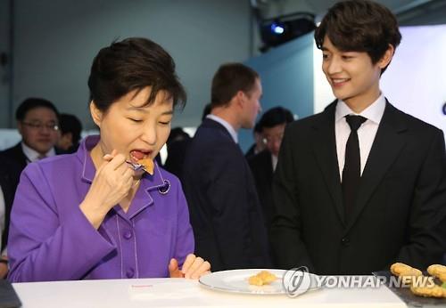 朴大統領は、韓国料理デザートバー「マシッタ」を訪問し、韓流スターのシャイニーのメンバーのミンホの案内を受けながら「ミニたい焼き」を試食した。