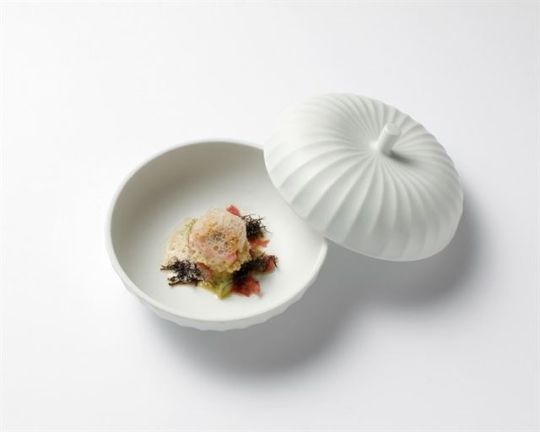 ウニで作った豆腐に海藻を添えて、多彩な味と質感を出したチャン・ジンモ・シェフの料理。