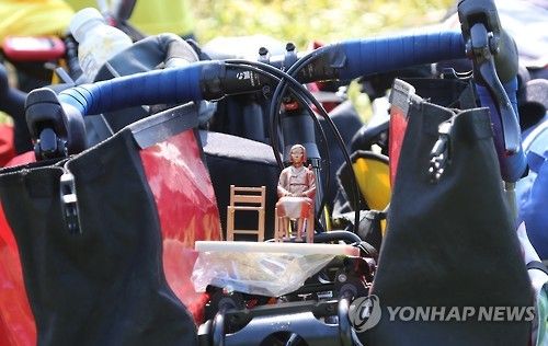 (グレンデール<米国カリフォルニア州> =聯合ニュース)チャン・ヒョング特派員=日本軍慰安婦の実状を知らせるための自転車アメリカ横断に出た韓国の大学生三銃士の自転車の上に位置する少女像のミニチュア。2016.6.26