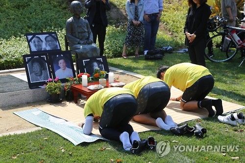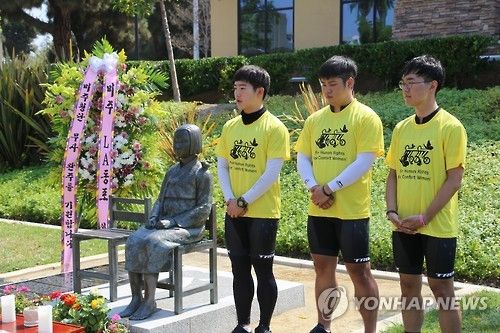 (ロサンゼルス=連合ニュース)チャン・ヒョング特派員=日本軍慰安婦の実状の広報のため、自転車で米国横断に出たトリプルAプロジェクト2期チーム3人が25日(現地時間)米国カリフォルニア州グレンデールの「平和の少女像」の前で開かれた出征式で、他界した犠牲者の遺影に礼をして覚悟を固めている。2016.6.26