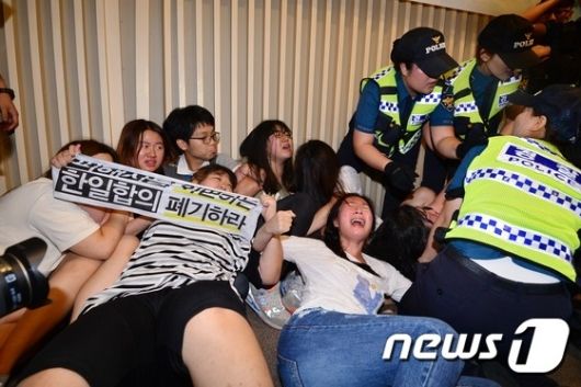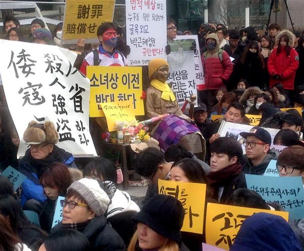 28日、慰安婦関連財団の発足式には、韓日合意に反対する者たちのデモがあると十分に予見されていた。