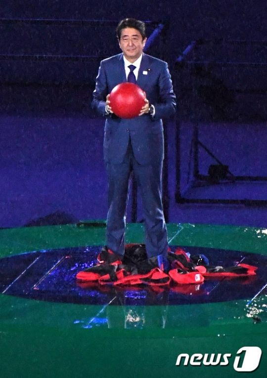 実際のマラカナン競技場に設置された瞬間移動装置に現れてスーパーマリオの役割を引き受けた人物は、日本の安倍晋三首相だった。