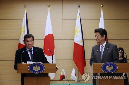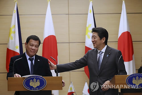 日本を訪問中のロドリゴ・ドゥテルテ・フィリピン大統領が26日、安倍晋三日本首相と首脳会談を行い、両国が経済・安全保障分野で協力を強化することで合意した。