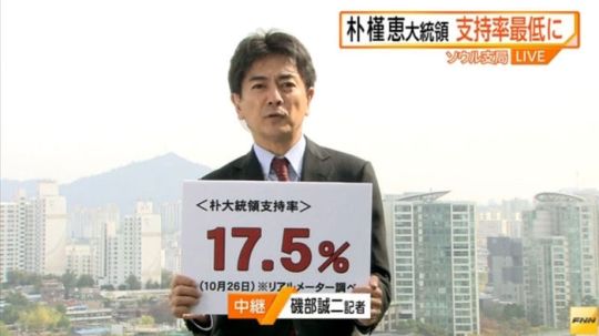 またパククネ大統領の支持率が17.5%(10月26日リアルメーターの調査)まで低下したという部分も漏らしませんでした。(本日発表されたギャラップ調査では、週間支持率が17%まで落ち、国民への謝罪後の26~27日は14%を記録したという報道が出ました。)