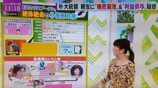 「パククネ大統領が公職に関与していない知人女性実業家に要人や外交などに関する内部資料を渡したものと見られます。」「チェ氏は政治には関与していなかったと主張しましたが、パククネ大統領への批判はおさまる兆しがありません。チェさんのタブレットPCを手に入れた韓国テレビ局は、スピーチの原稿だけでなく、大統領府の人事や日本との外交等に関する内部資料など、少なくとも200点をチェ氏に渡したと伝えました。一部のセヌリ党の議員たちは、来年の大統領選挙への影響を考慮して『大統領は離党しなければならない』と主張しており、若年層からは『下野しなければならない』という声が出ています。」