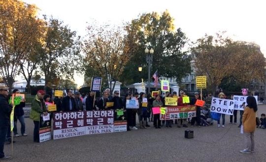 一方で5日には、ワシントンD.C.ホワイトハウス前でも、韓国人100人がパククネ退陣とサード配置反対を叫んで集会が開かれた。