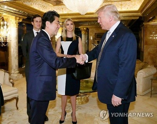 握手する安倍(左)とトランプ。後ろにはトランプの長女イバンカ(右)と義理の息子のクシュナー。