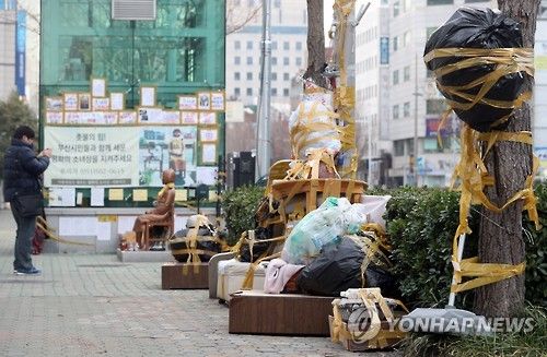 真実国民団体は7日、少女像の周辺に、「いつまで日本を憎むのか」と書いた紙を貼った紙をつけた植木鉢を持っていって、街路樹にテープで縛り付けたのも自分たちがしたことだと明らかにした。