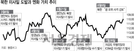 米海軍カールビンソン号が韓半島に向かった4月10日、北朝鮮が平安北道でミサイル1基を発射した5月14日、北朝鮮が大陸間弾道ミサイル(ICBM)級ミサイル発射実験をした7月28日以降も円は、以前よりむしろ強気を示した。