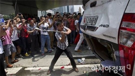 中国で発生したした反日集会で市民が日本産の車を壊している。