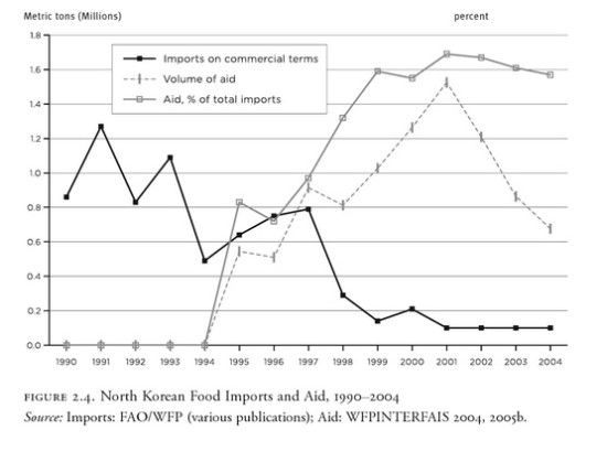 北朝鮮はむしろ飢饉が発生する前のほうが輸入量が多かったが、国際社会が援助をすると、むしろ輸入量を減らしてしまったのだ。