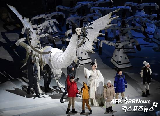 去る9日、江原道の平昌オリンピックスタジアムで行われた平昌冬季五輪の開会式で、この鳥が無表情な人の顔で、骨が曲がった奇妙な翼をはためかせ、高句麗時代の服のダンサーたちと一緒に踊って退場した。