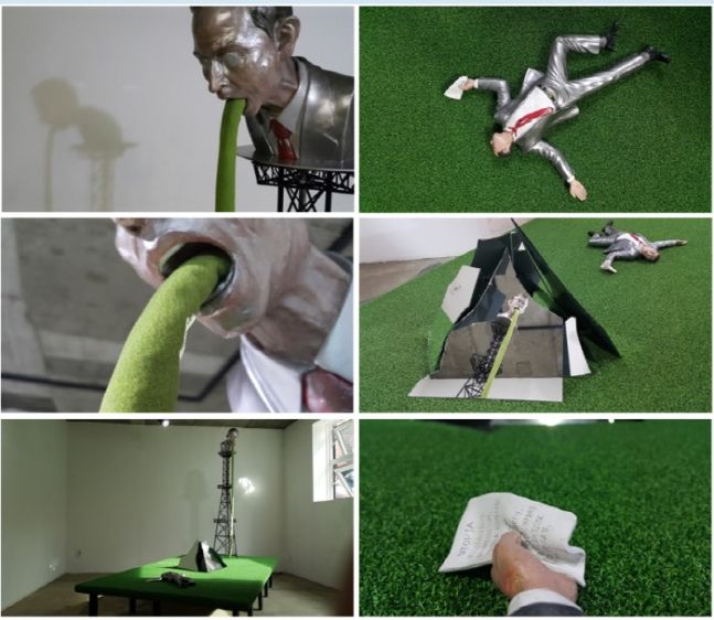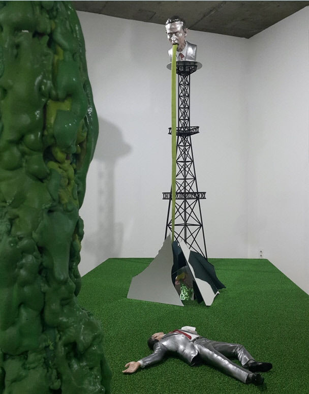 別の設置作品「緑の協力」は、緑の嘔吐物を吐き出す李明博の右に作家自身の顔を入れた。