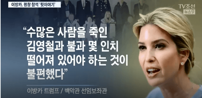 「多くの人を殺したキムヨンチョルと近くに座っているというのは不快だった。」平昌冬季オリンピックに参加して帰ったイバンカ・トランプは、米国のメディアとのインタビューでいった言葉です。