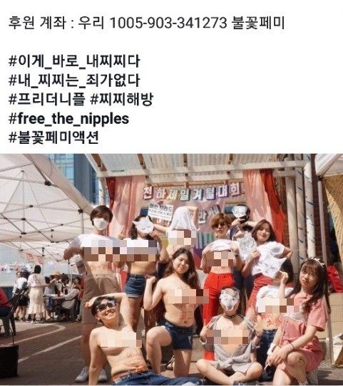 これにアクションの会員10人が去る2日午後1時ごろ、ソウル江南区駅三洞のフェイスブックコリア社屋の前で上半身を脱いだ後、「私の体はポルノではない」などのスローガンを叫んで抗議デモを行った。