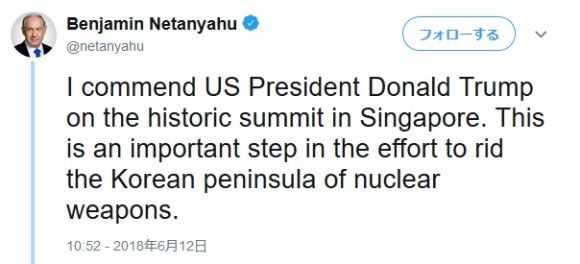 I commend US President Donald Trump on the historic summit in Singapore. This is an important step in the effort to rid the Korean peninsula of nuclear weapons.