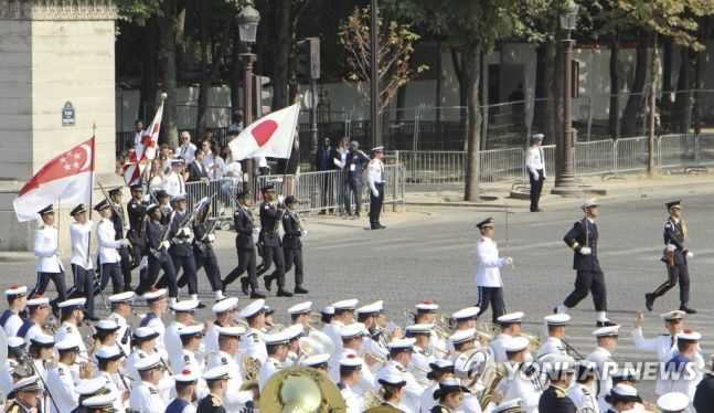 フランス革命記念日パレードに参加した日本の陸上自衛隊が14日(現地時間)、フランス・パリシャンゼリゼ通りから日の丸と共に日本の軍国主義を象徴する「旭日昇天旗」を一緒に持って行進した。