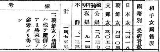 この調査報告書にも、「今回の事変においては、半島の婦女の進出が活発だが、病気を持っている者が多い」と記録されている。