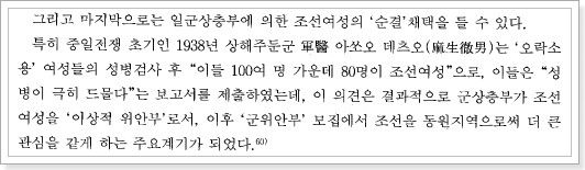 『そして最後に、日本軍上層部による朝鮮女性の「処女」採用を挙げることができる。特に中日戦争初期の1938年上海駐屯軍軍医の麻生徹男は、女性の性感染症の検査の後、「彼女たち100人のうち80人が朝鮮の女性」とし、彼女たちについて「性病にかかっている者がほとんどいない」という報告書を提出した。この意見は結果的に、軍上層部が朝鮮女性を「理想的な慰安婦」と見て、以後の「従軍慰安婦」の募集で朝鮮を動員地域としてより大きな関心を持つ重要なきっかけとなった。』