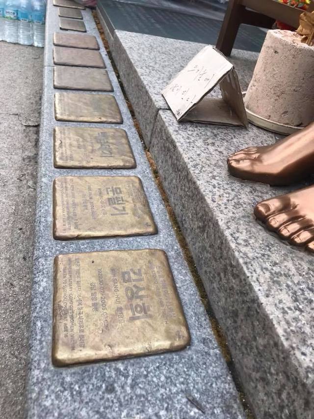 ソウル市中区の日本大使館の向かい側の少女像の前に設置された記憶プレート。