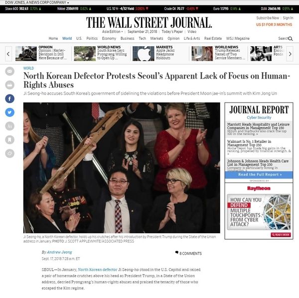 17日(現地時間)、ウォールストリートジャーナル(以下WSJ)は、「脱北者、北朝鮮の人権問題が提起されない南北首脳会談について強力抗議(North Korean Defector Protests Seoul's Apparent Lack of Focus on Human-Rights Abuses)」という題のアンドリュー・ジョン(Andrew Jeong)韓国特派員記者のルポ記事を掲載した。
