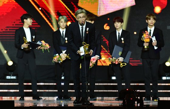 防弾少年団(BTS)RMが24日午後、ソウルオリンピック公園オリンピックホールで開かれた「2018大韓民国大衆文化芸術賞」授賞式に出席している