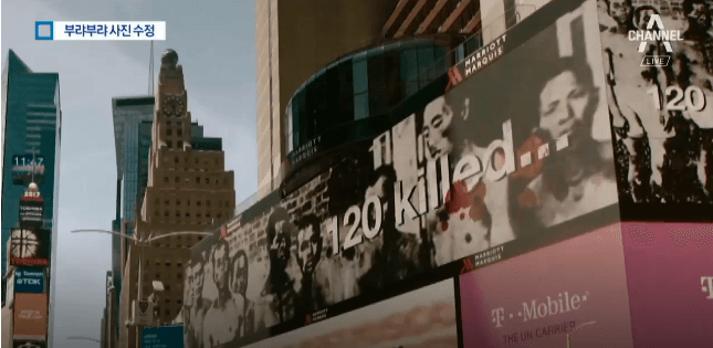 この写真は、小学校はもちろん、中学校や高校の歴史教科書にも堂々と載っていて、2年前に軍艦島の真実を明らかにするとしてニューヨークのタイムズスクエアの屋外広告看板に上映された映像にも登場しました。