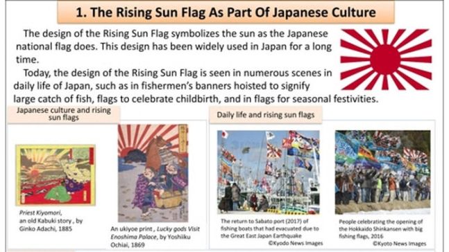 ・「旭日旗は海上自衛隊の艦艇旗や陸上自衛隊の自衛隊機として不可欠な役割を果たしており、国際社会で幅広く受け入れられている」